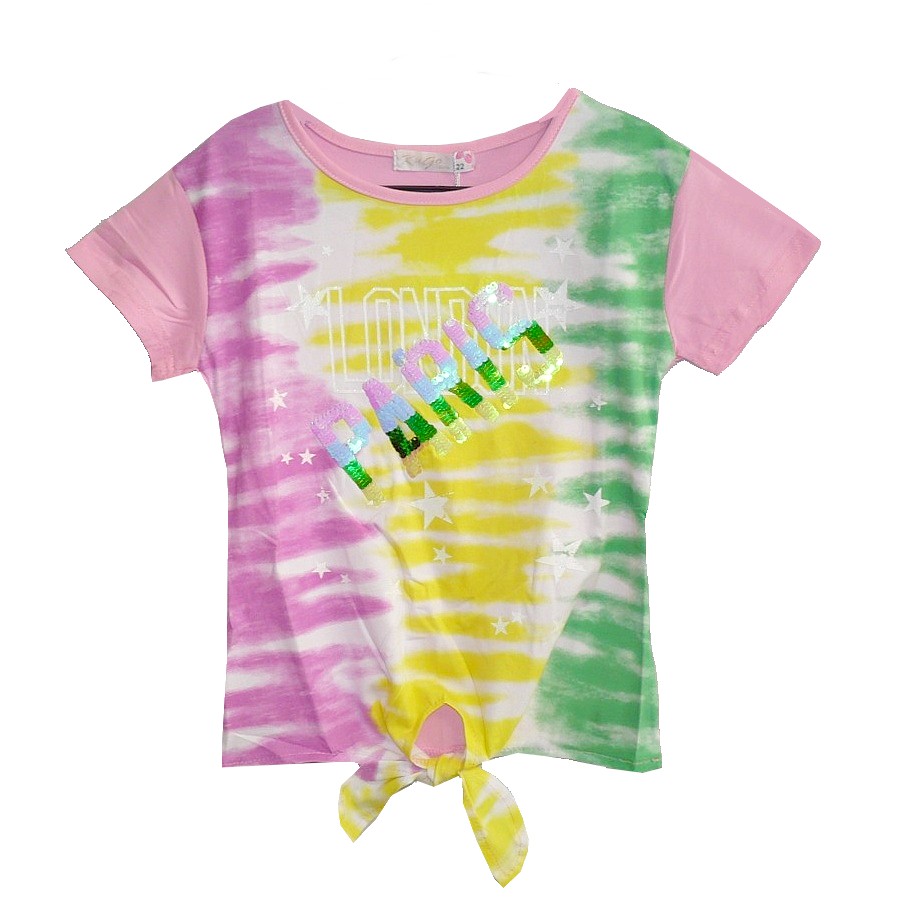 Dívčí tričko Kugo s krátkým rukávem: Složení 95% bavlna, 5% elastan, na předním díle nápis z obracecích flitrů. Dolní okraj má zavazovací konce (ozdobný uzel). Velmi pohodlný materiál.