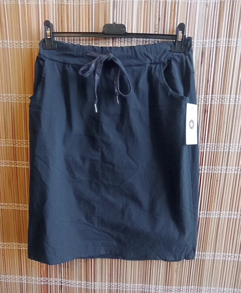 Dámské sportovní sukně talská móda: Složení 55% polyester, 40% viskoza, 5% elastan, sportovní materiál, v pase pružná guma + tkanička na stažení, na bocích dvě kapsy.