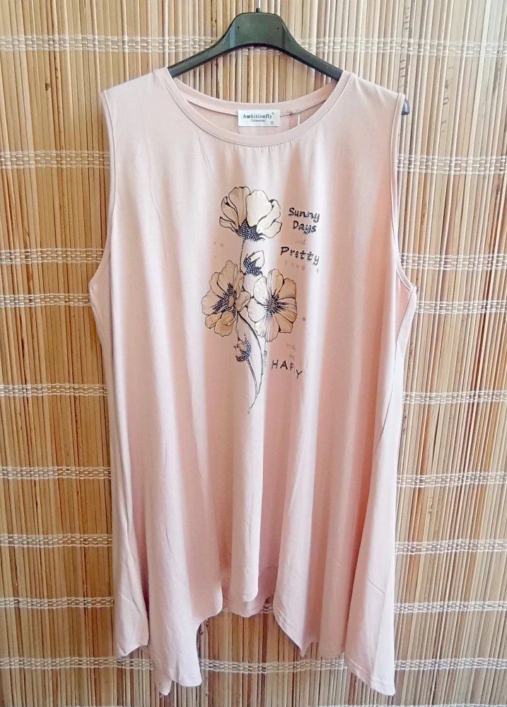 Dámská volná tunika/krátké šaty na široká ramínka: Složení 95% bavlna, 5% elastan, na předním díle obrázek květin + nápis, kulatý výstřih, volný střih do A, dolní okraj do obloučku.