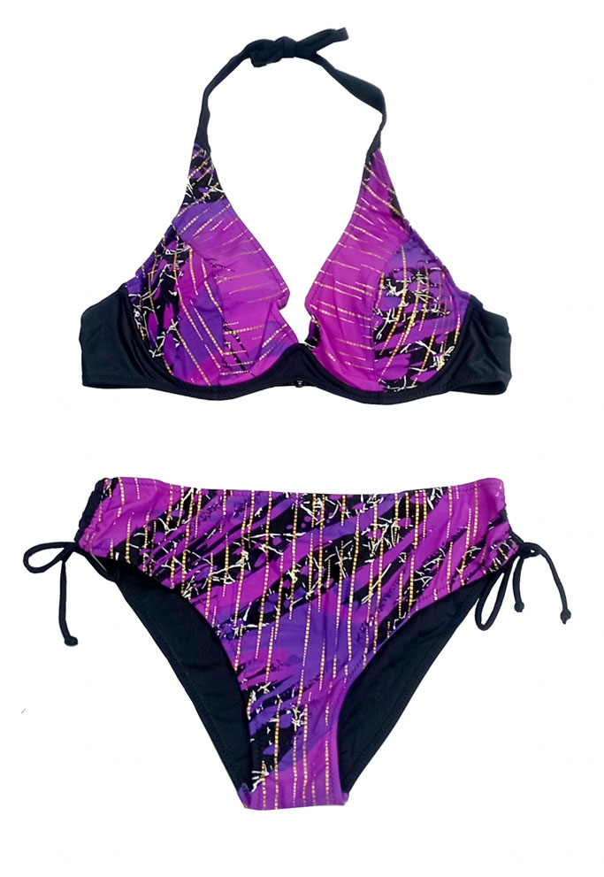 Dámské dvoudílné plavky: Složení 80% polyamid, 20% elastan. Zapínání na zádech na přesku, ramínka na zavazování za krk. Kalhotky klasického střihu. Podprsenka je s kosticemi s výstužemi, které jdou vyndat.