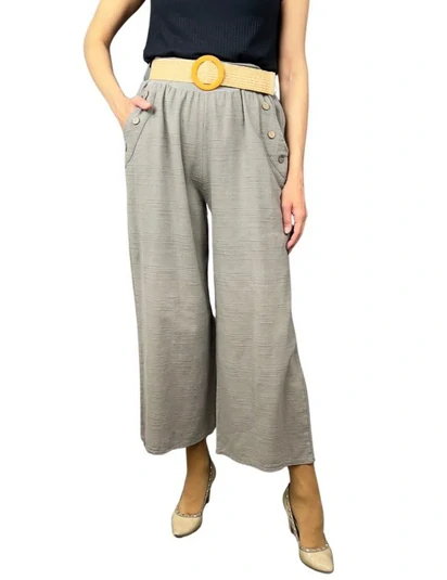 Dámské letní elegantní kalhoty: Složení 100% bavlna, vyšší elastický pas, stylový pásek s kulatou sponou, volné nohavice, délka ke kotníkům, dvě kapsy s ozdobnými knoflíky, slušivá italský móda.