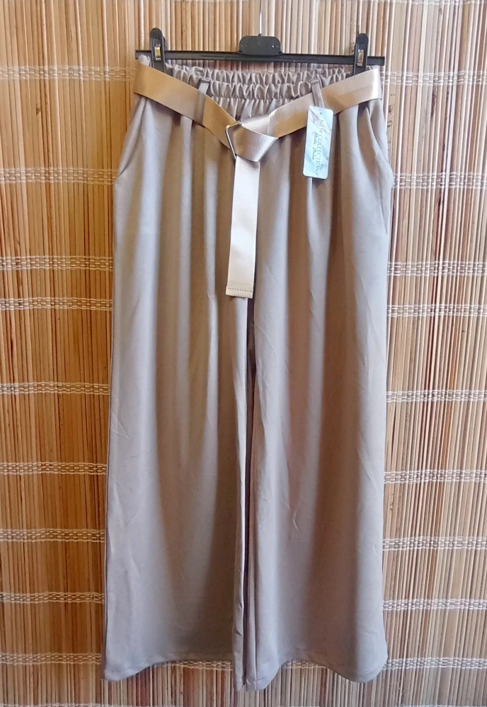Dámské široké kalhoty italská móda: Složení 52% polyester, 40% viskoza, 8% elastan, v pase pružná guma, poutka na pásek + pásek, na bocích dvě kapsy, nohavice jsou do širokého volného střihu.
