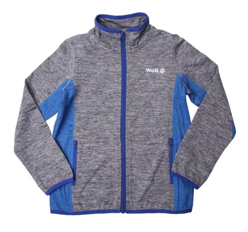 Chlapecká funkční mikina WOLF: Složení 90% polyester, 10% elastan. Uvnitř má mikina jemný chloupek, má velmi příjemný pohodlný materiál s funkčními vlastnostmi, zapínání na zip až ke krku, na bocích dvě kapsy na zip, rukávy mají na konci otvor na palec. Vhodné na sport i běžné nošení.