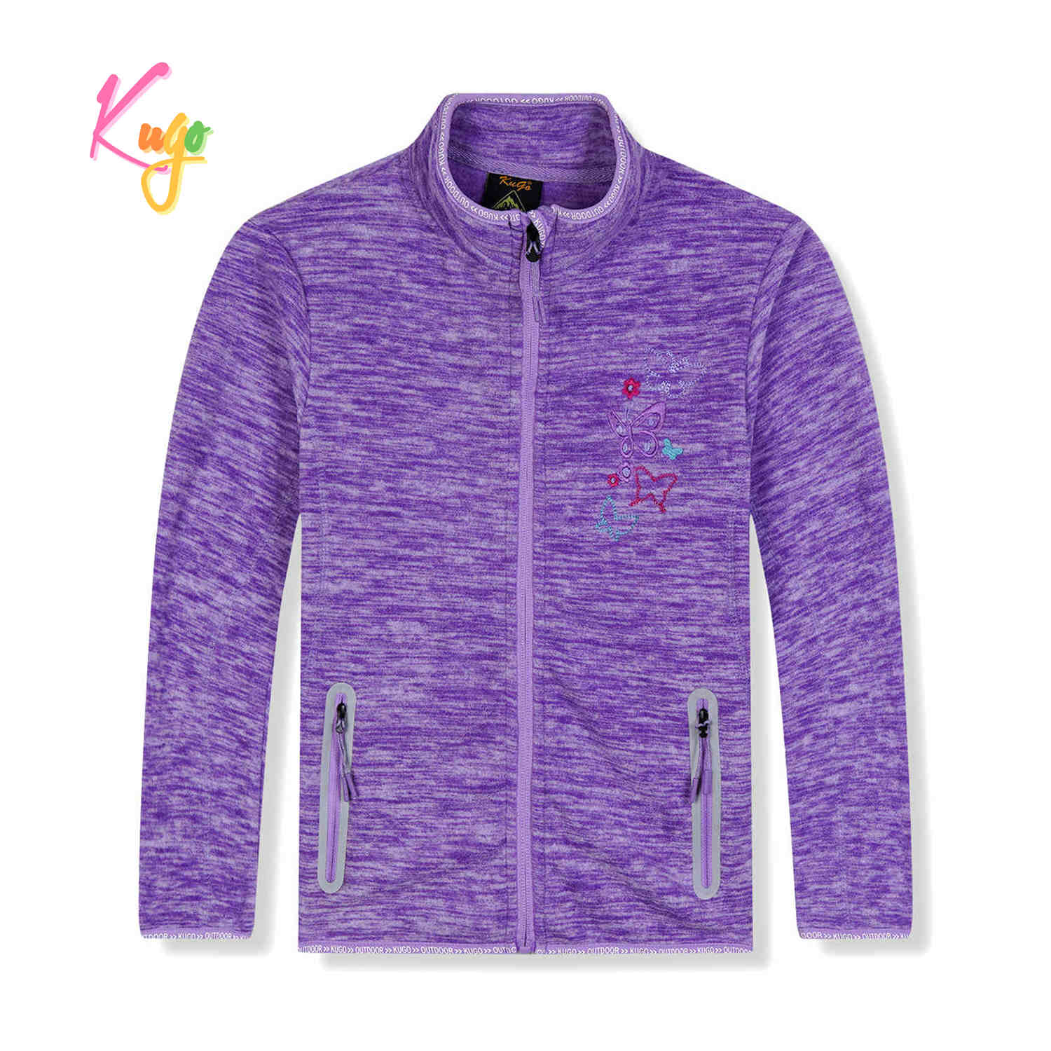 Dívčí mikina flís KUGO: Složení 65% bavlna, 35% polyester, zapínání za zip, na bocích dvě kapsy na zip, rukávy a dolní okraj mikiny zakončené pružnou gumičkou.
