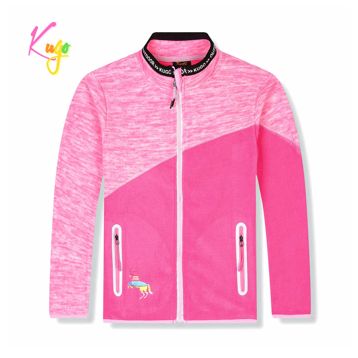 Dívčí mikina flís KUGO: Složení 65% bavlna, 35% polyester, zapínání za zip, na bocích dvě kapsy na zip, rukávy a dolní okraj mikiny zakončené pružnou gumičkou.