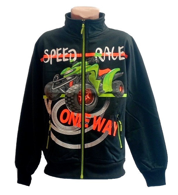 Chapecká mikina KUGO: Složení 100% bavlna, zapínání na zip po celé délce, u krku stojáček. Na bocích dvě kapsy na zip, rukávy do praktických manžet. Dolní okraj mikiny je také lemovaný pružnou manžetou. Na předním díle obrázek čtyřkolky.
