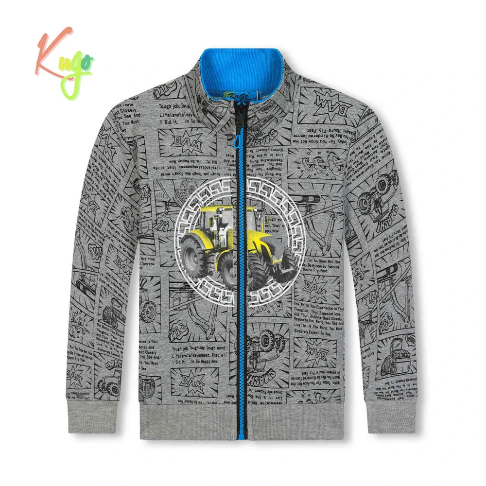 Chlapecká tenká mikina Kugo: Složení - 95% bavlna, 5% elastan, propínací na zip, na bocích dvě kapsy, rukávy do manžet, na předním díle obrázek traktoru, po celé mikině komiksové obrázky a nápisy.