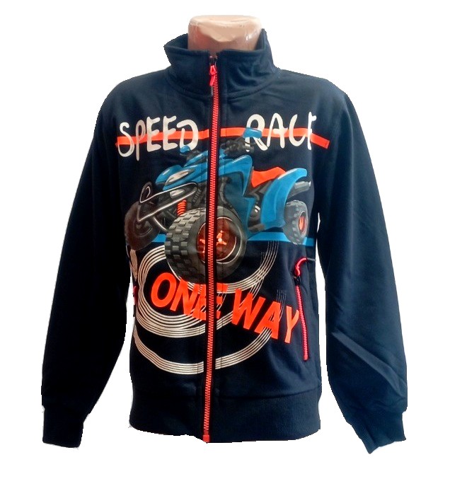 Chapecká mikina KUGO: Složení 100% bavlna, zapínání na zip po celé délce, u krku stojáček. Na bocích dvě kapsy na zip, rukávy do praktických manžet. Dolní okraj mikiny je také lemovaný pružnou manžetou. Na předním díle obrázek čtyřkolky. Vel.116 = délka 48cm, šířka 35x2cm, rukáv od krku 53cmVel.122 ... celý popis