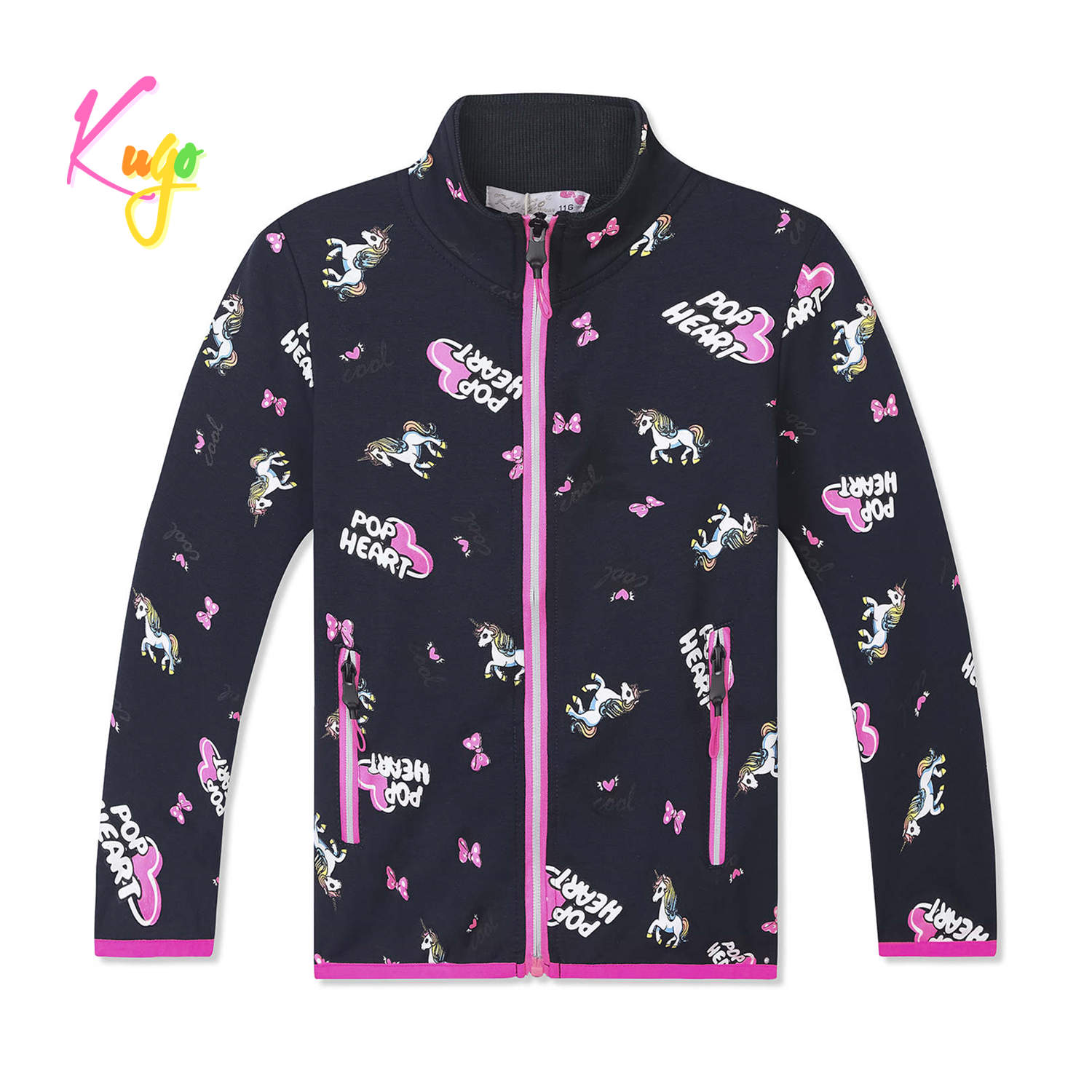 Dívčí mikina na zip: Složení 95% bavlna, 5% elastan, zapínání po celé délce na zip, na bocích dvě kapsy, rukávy a dolní okraj mikiny zakončený pružnou gumičkou.