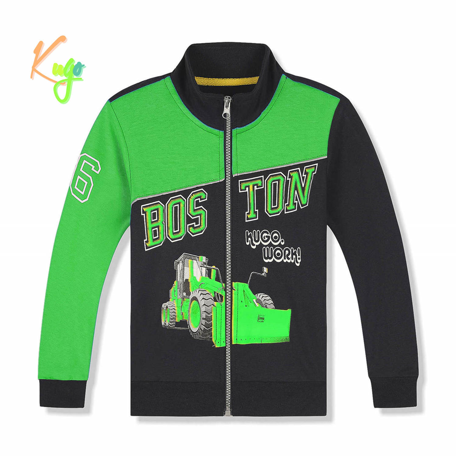 Chlapecká mikina KUGO: Složení 95% bavlna, 5% elastan, zapínání na zip, na bocích dvě kapsy, rukávy a dolní okraj mikiny do pružným manžet.