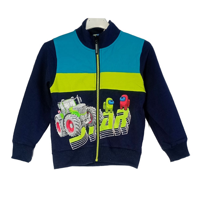 Chlapecká mikina KUGO: Složení 95% bavlna, 5% elastan, zapínání na zip až ke krku, na bocích dvě kapsy, rukávy do manžet, dolní okraj mikiny zakončený pružným lemem. Na předním díle obrázek . Velmi příjemný materiál.