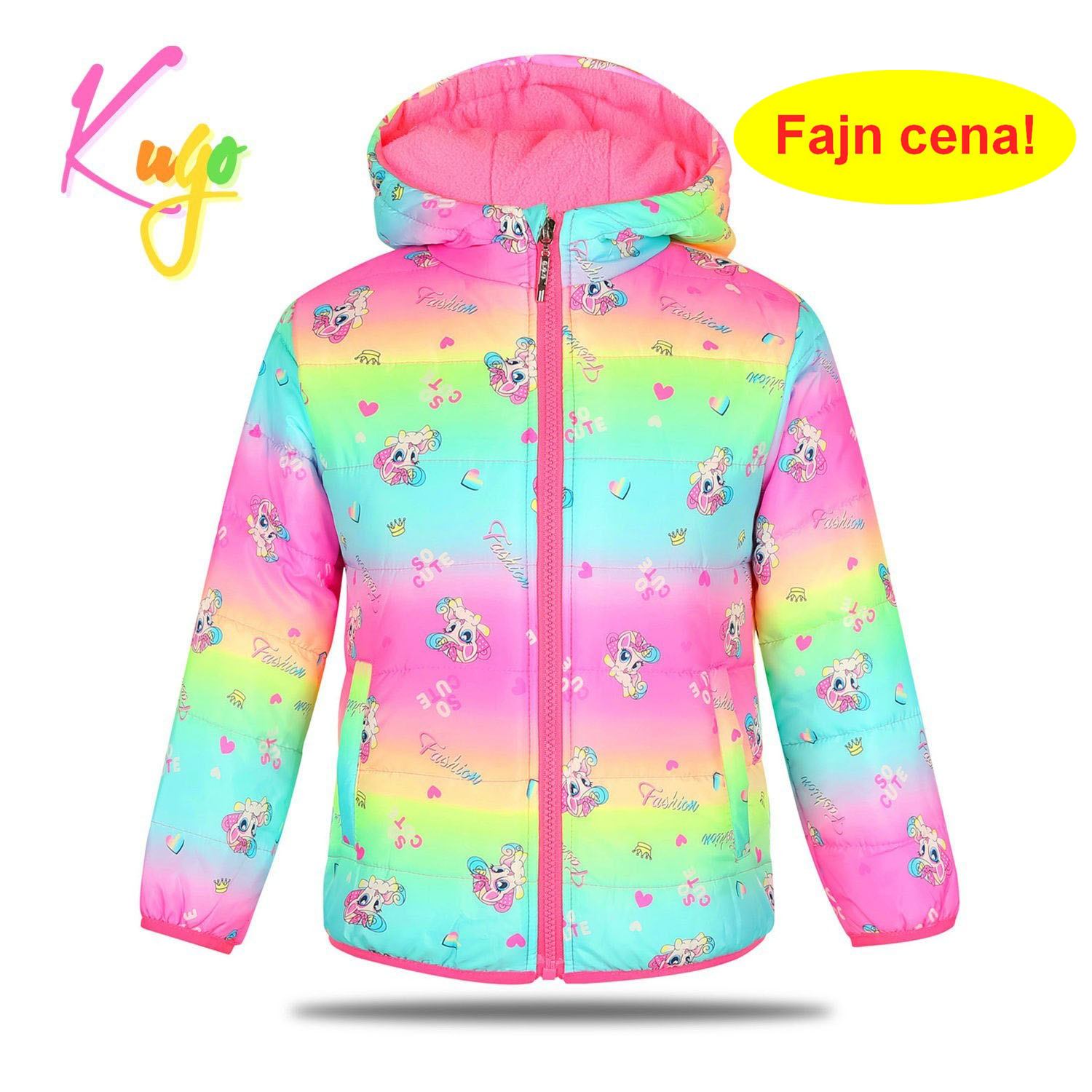 Dívčí zimní šusťáková bunda zateplená jemným flísem: Složení 100% polyester, bunda je prošívaná, vrchní materiál hladký matný šusťák, uvnitř teplá podšívka z jemného teplého flísu, rukávy uvnitř zateplené a podšité šusťákem, zapínání po celé délce až ke krku, kde je krytí, kapuce je napevno, rukávy a dolní okraj mají pružný lem, na bocích dvě kapsy. Bunda je vhodná na mírnou zimu.