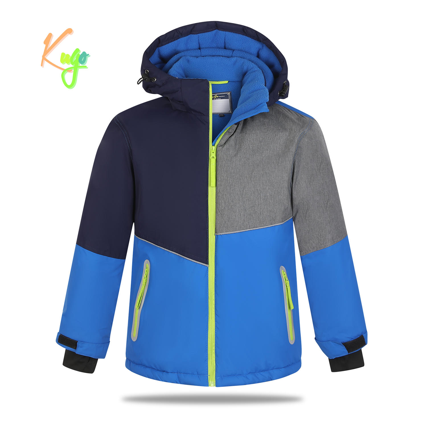 Chlapecká zimní bunda KUGO: Složení 100% polyester, povrch z nepromokavého kvalitního šusťáku, uvnitř je bunda vyteplená hřejivým dutým vlákem, záda podšitá flísem, rukávy látkou, bunda má tzv. lyžařský pás, rukávy jsou zakončené népletem s otvorem na palec, dolní okraj bundy se dá stáhnout, rukávy také, kapuce je odepínací se stahováním, na bocích má bunda dvě kapsy na zip s reflexními prvky.