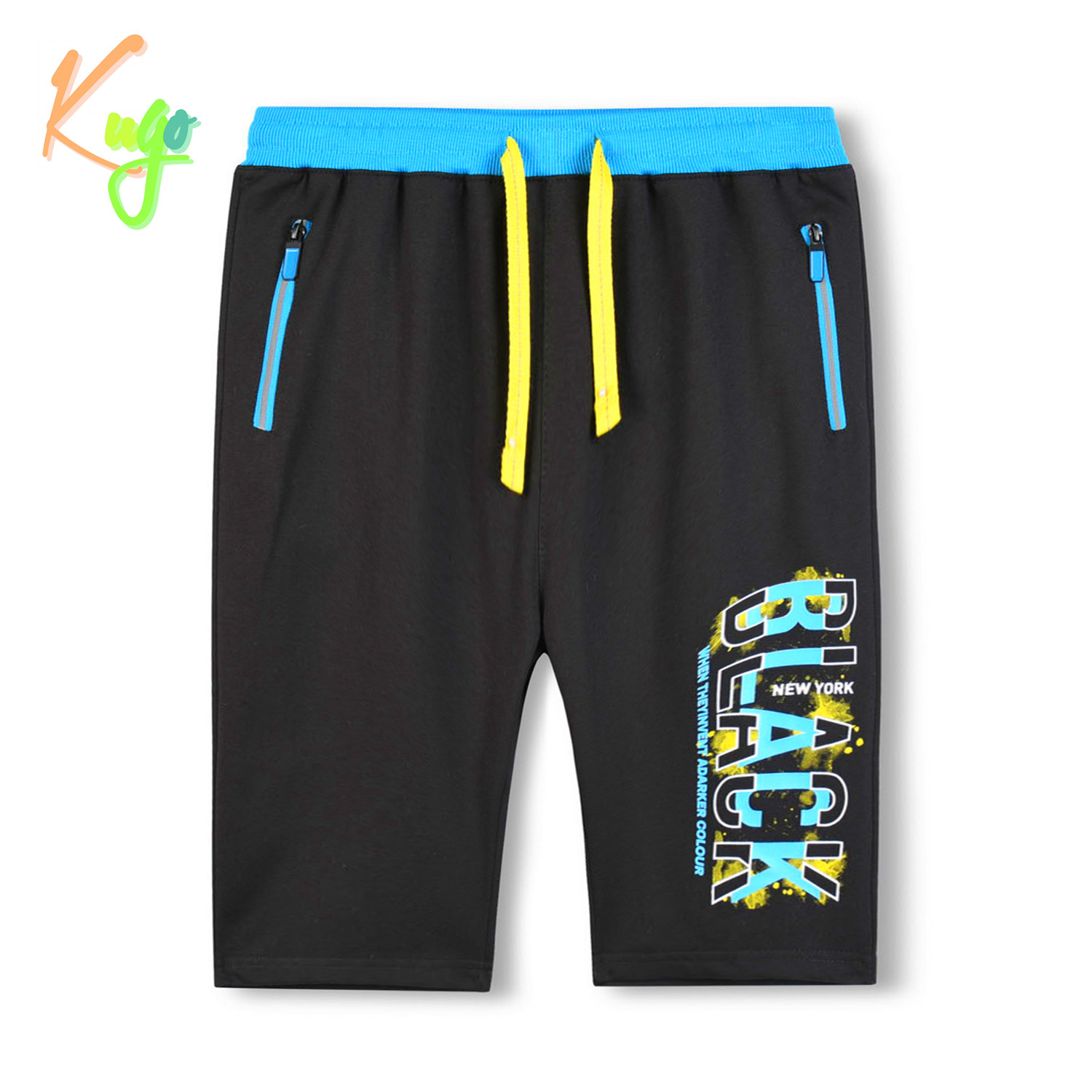 Chlapecké 3/4 tepláky KUGO: Složení 100% bavlna, v pase pružná guma + tkanička na stažení, na bocích dvě kapsy na zip, na nohavici nápis. Velmi pohodlné a praktické.