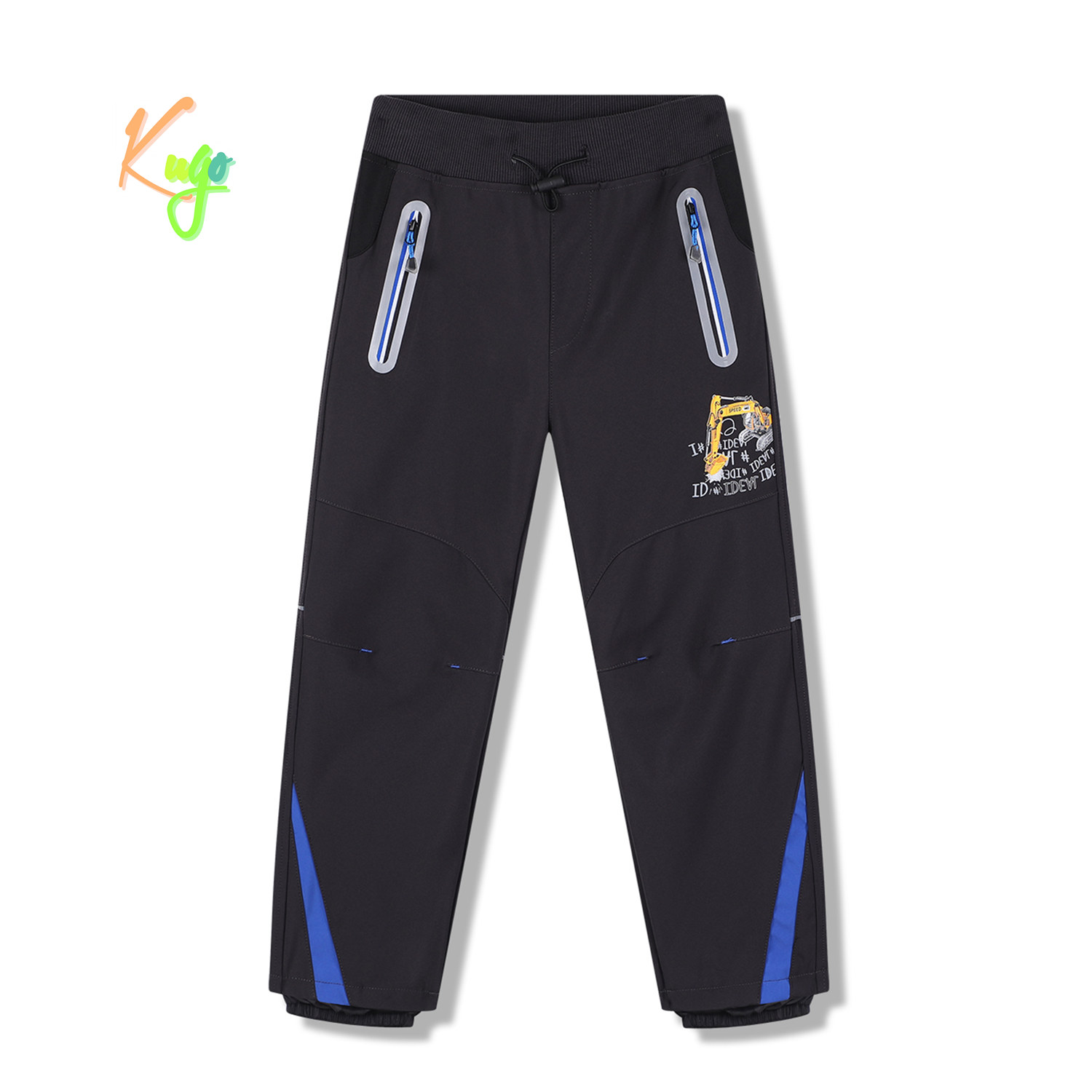 Chlapecké jarní softshellové kalhoty KUGO: Složení 100% polyester, nepromokavý povrch, uvnitř slabá děrovaná podšívka, v pase pružná guma + stahování, na bocích kapsy na zip, reglexní prvky, pohodlný a prodyšný materiál. Vhodné na jaro a podzim do deště. Na konci nohavic membrány proti vniknutí vody.