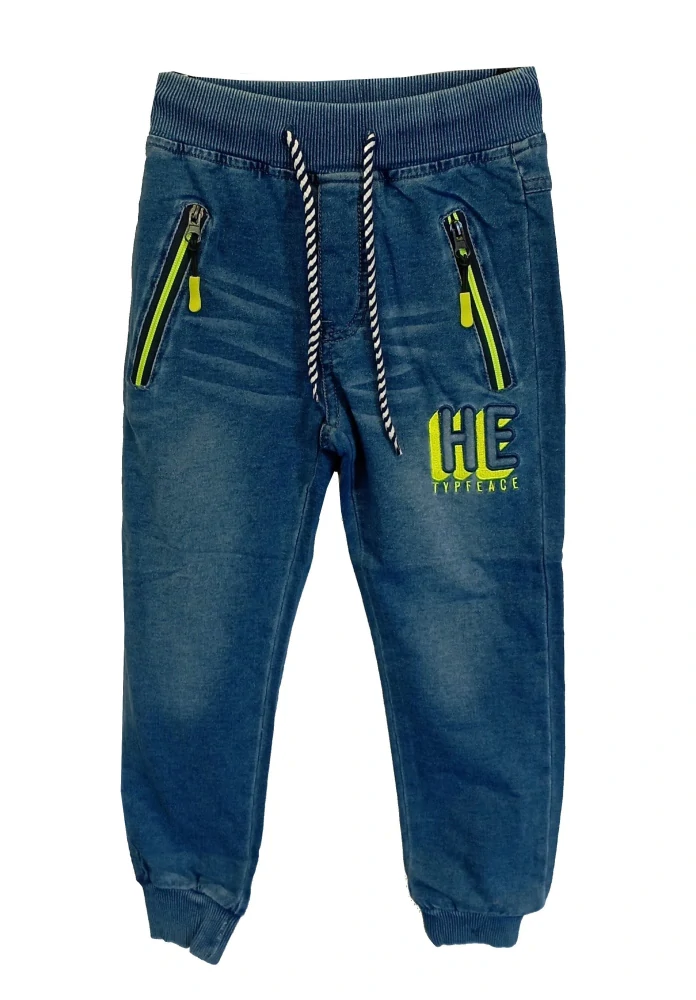Chlapecké kalhoty/tepláky riflového vzhledu: Složení 95% bavlna, 5% elastan. Materiál měkký, velmi příjemný, v pase pružná guma + tkanička na stažení, na bocích dvě kapsy na zip, na zadku také dvěkapsy, nohavice zakončené manžetami.