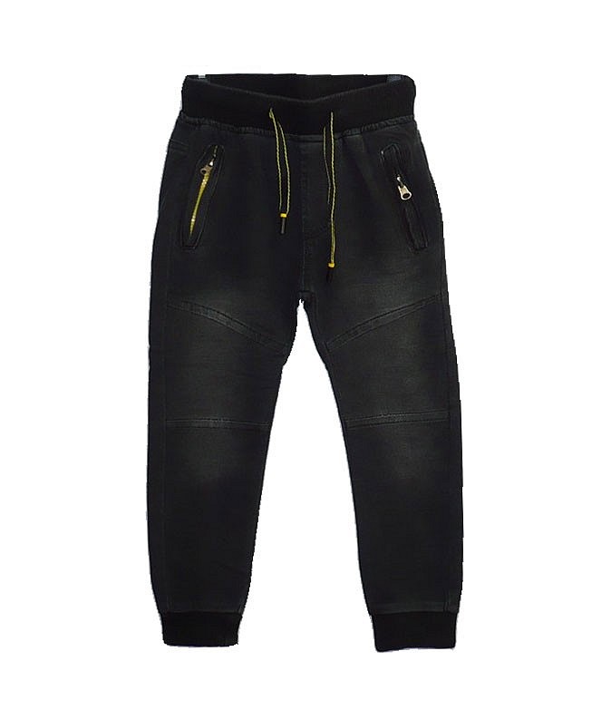 Chlapecké kalhoty/tepláky riflového vzhledu: Složení 95% bavlna, 5% elastan. Materiál měkký, velmi příjemný, v pase pružná guma + tkanička na stažení, na bocích dvě kapsy na zip, na zadku také dvěkapsy, nohavice zakončené manžetami.