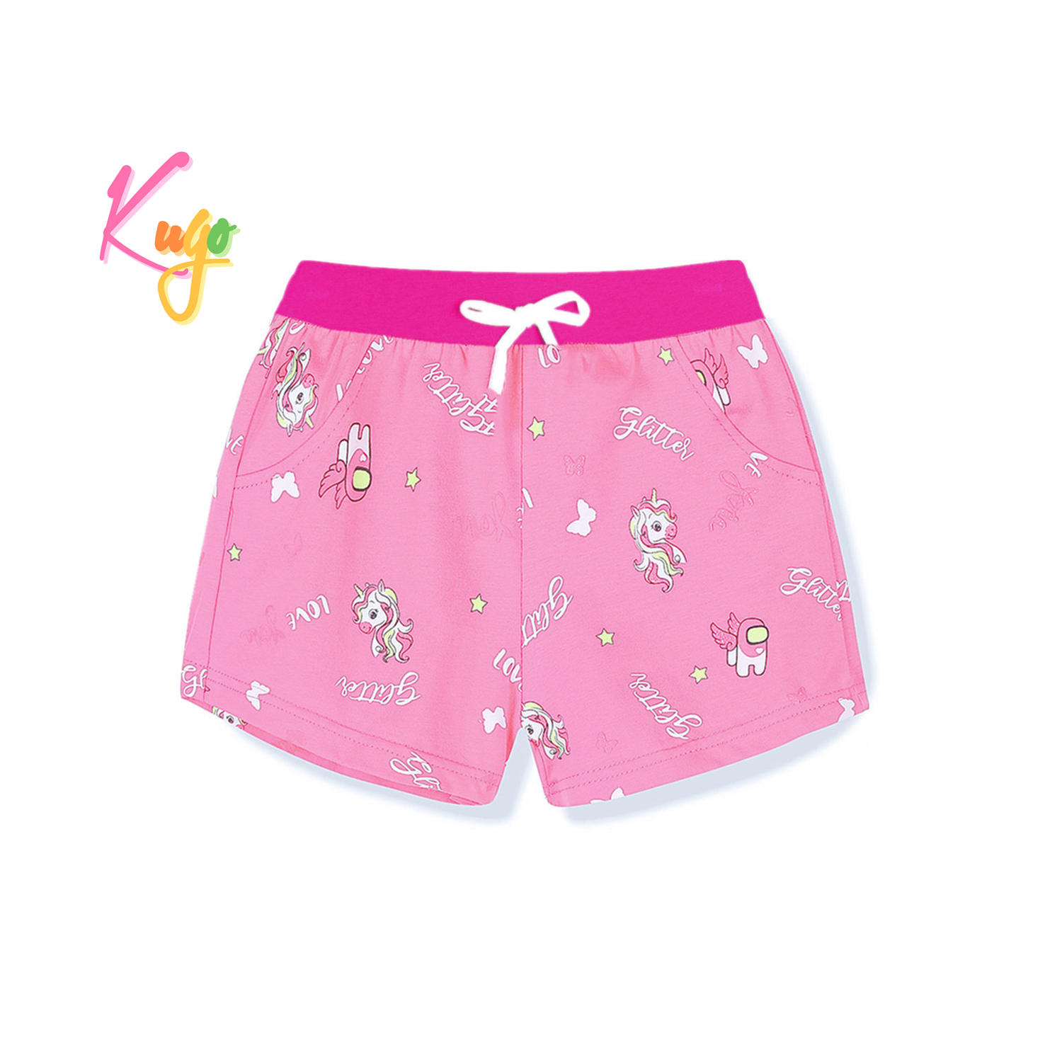 Dívčí kraťasy KUGO: Složení 95% bavlna, 5% elastan, v pase pružná guma, veselý vzhled s obrázky a nápisy, příjemný slabý materiál.