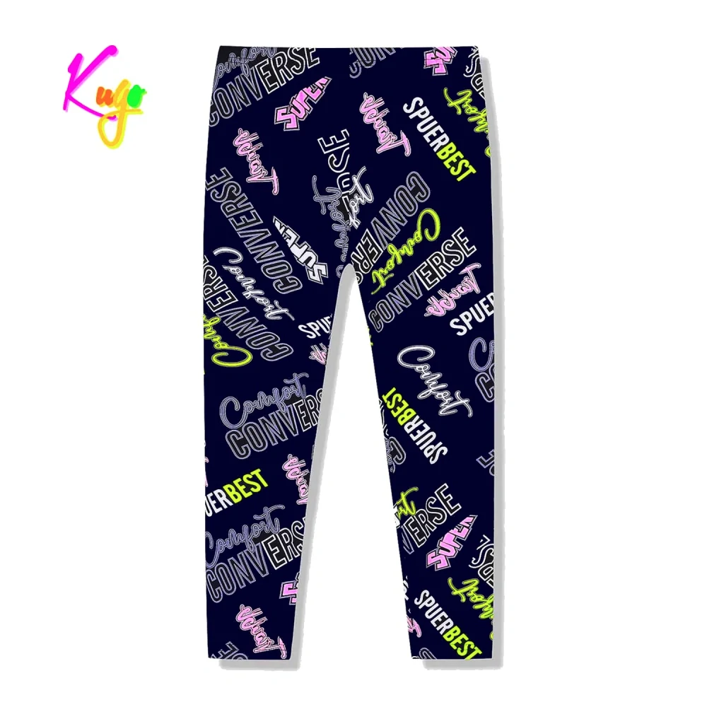 Dívčí legíny KUGO: Složení 95% bavlna, 5% elastan. V pase pružná guma, materiál je velmi příjemný, na legínách barevné nápisy.