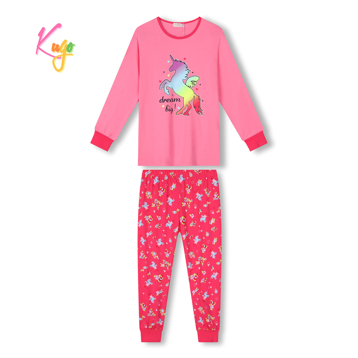 Dívčí pyžamo KUGO: Složení 100% bavlna, v pase pružná guma, rukávy a nohavice do manžet, na pyžamu veselé obrázky jednorožců. Příjemný bavlněný materiál.