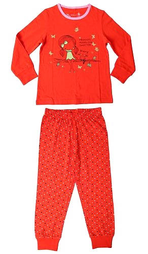 Dívčí bavlněné pyžamo Wolf: Složení 100% bavlna, kalhoty mají v pase pružnou gumu, rukávy i nohavice zakončené náplety. Na předním trička obrázek, kalhoty jsou s jemným vzorem - puntíky. Velmi pohodlný materiál.