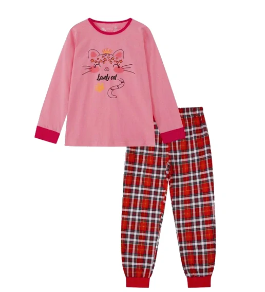 Dívčí bavlněné pyžamo WOLF: Složení 100% bavlna, dlouhý rukáv, dlouhé nohavice, rukávy a nohavice ukončené do bavlněného nápletu, v pase pružná guma.