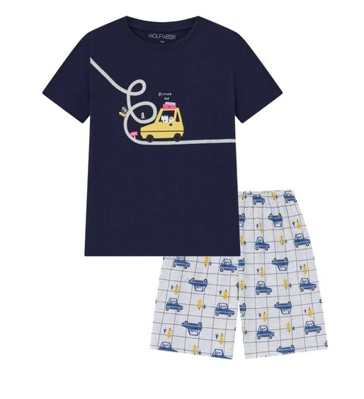 Chlapecké bavlněné pyžamo WOLF: Složení 100% bavlna, krátký rukáv i nohavice, kulatý výstřih u krku, v pase pružná guma, s potiskem.