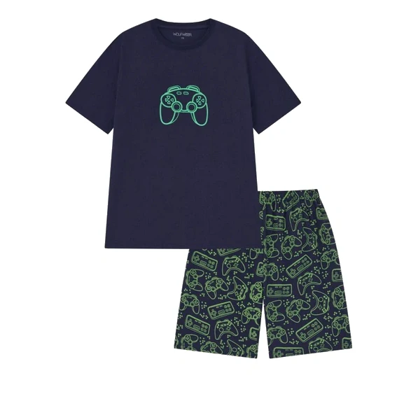 Chlapecké bavlněné pyžamo WOLF: Složení 100% bavlna, krátký rukáv i nohavice, kulatý výstřih u krku, v pase pružná guma, s potiskem.