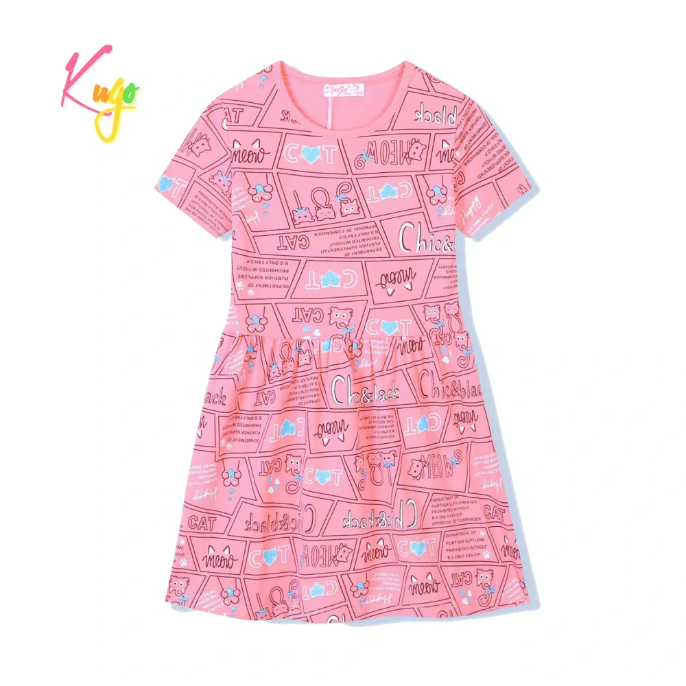Dívčí barevné šaty KUGO: Složení: 95% bavlna, 5% elastan, kulatý výstřih, od pasu se rozšiřují, po celém povrchu nápysy a obrázky koček.