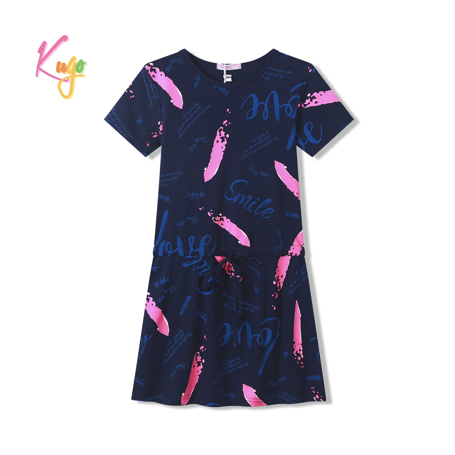 Dívčí šaty KUGO: Složení 95% bavlna, 5% elastan, v pase tkanička na stažení, mají velmi příjemný materiál.