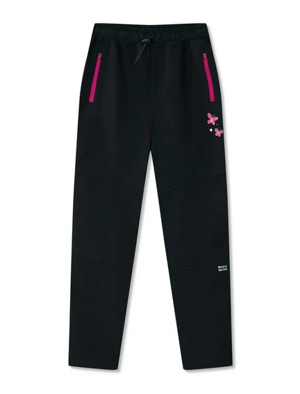 Dívčí softshellové kalhoty WOLF zateplené jemným flísem: Složení 100% polyester, voděodolné, nepromokavé, neprofouknou, vodní sloupec: 8000 mm H₂O, prodyšnost: 3000 g/m²/24 h, v pase do gumy s gumičkou a olivkou na stažení, na přední straně dvě zapínací kapsy, s drobným potiskem, reflexní prvky.