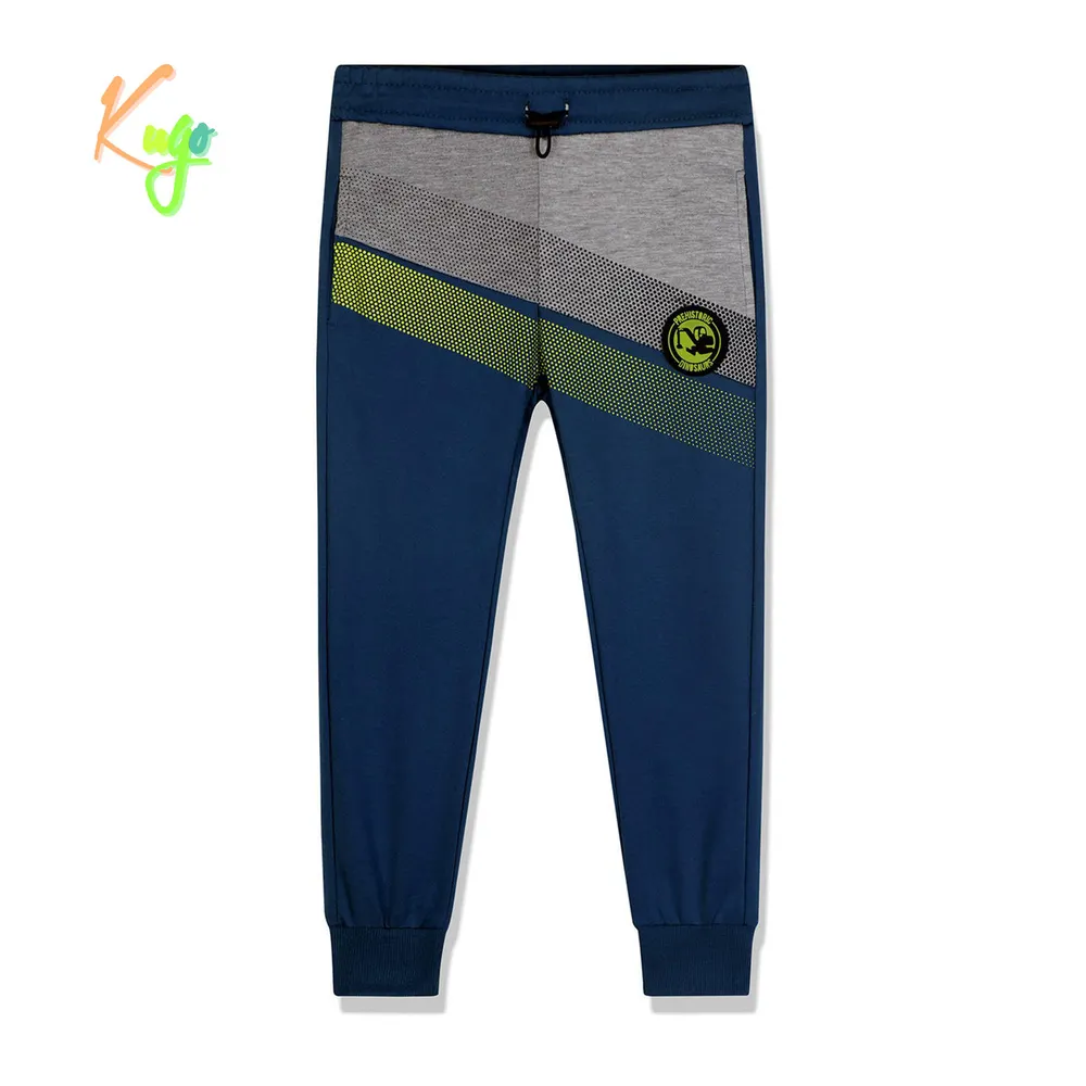Chlapecké tepláky KUGO: Složení 100% bavlna, v pase pružná guma + stahování, nohavice zakončené manžetami, na bocích dvě kapsy.