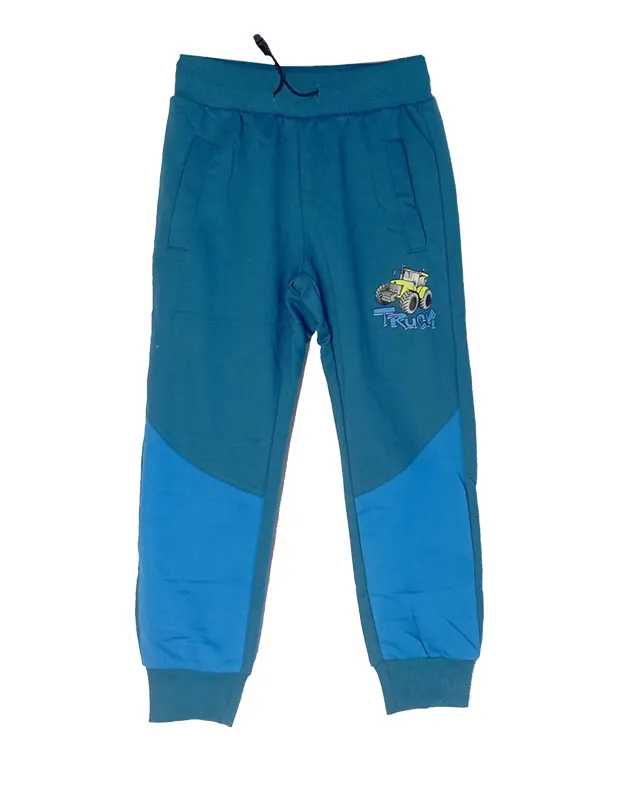 Chlapecké tepláky KUGO: Složení 100% bavlna, v pase pružná guma + stahování, nohavice zakončené manžetami, na bocích dvě kapsy, na pravé nohavici malý obrázek traktoru.