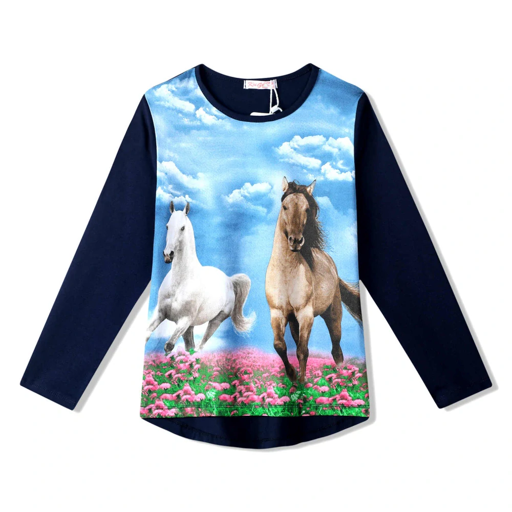 Dívčí tričko s dlouhým rukávem KUGO: Složení 95% bavlna, 5% elastan, na přední straně obrázek koní, potisk přímo v látce, není pogumovaný, zadní díl o něco delší, než přední.