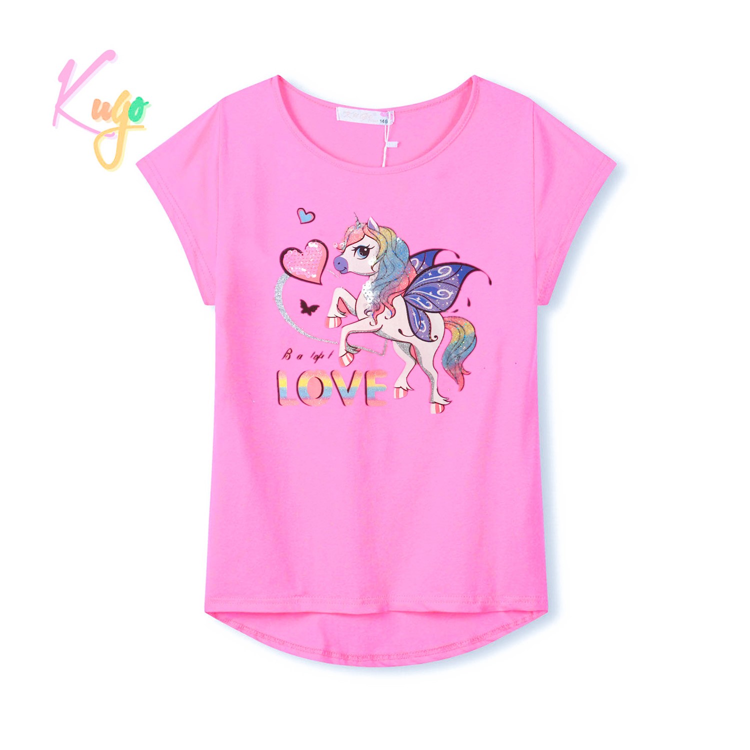 Dívčí tričko KUGO: Složení 95% bavlna, 5% elastan, na předním díle obrázek jednorožce, zadní díl delší.