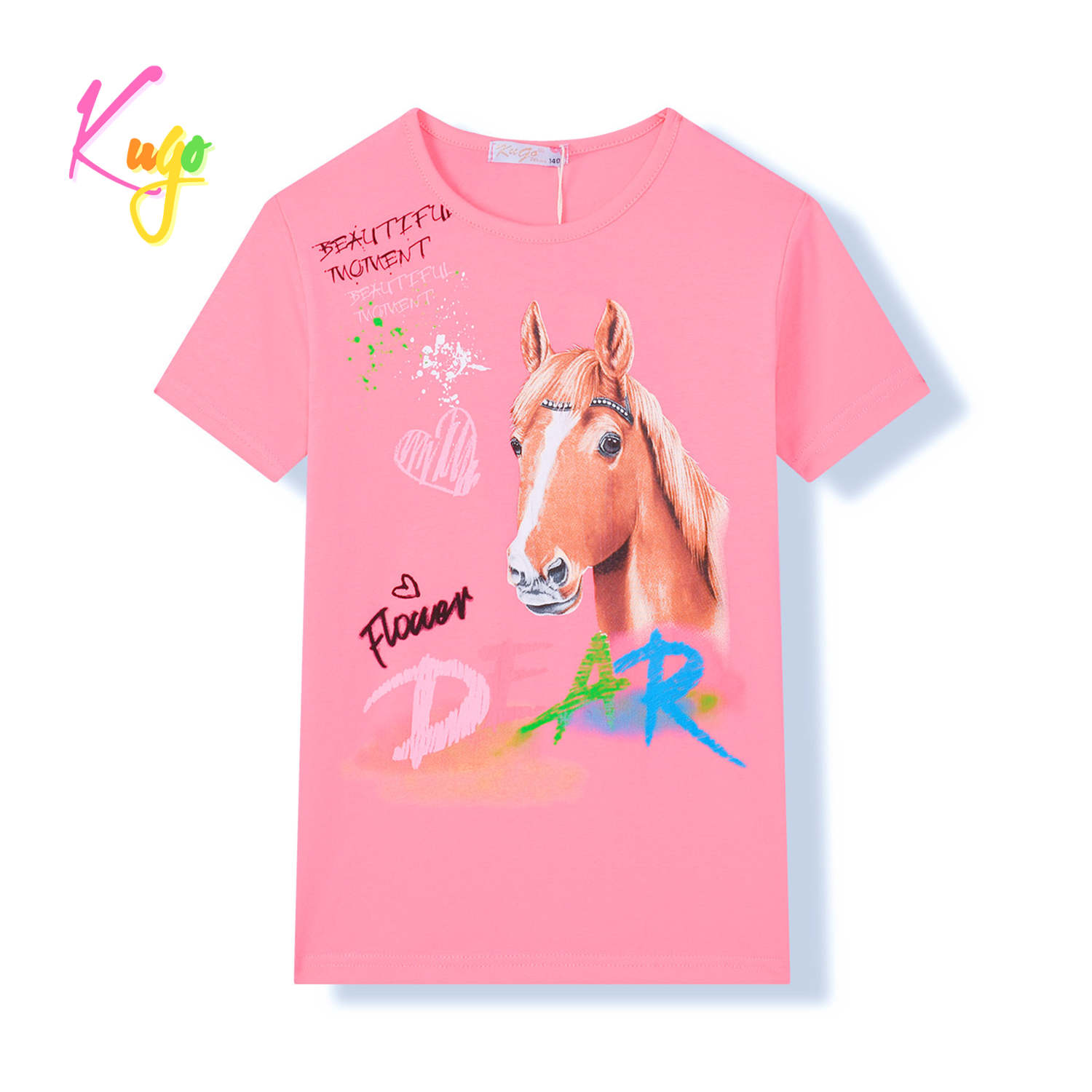 Dívčí tričko s krátkým rukávem: Složení 95% balvna, 5% elastan, na předním díle obrázek koně. Vemi příjemný a kvalitní materiál.