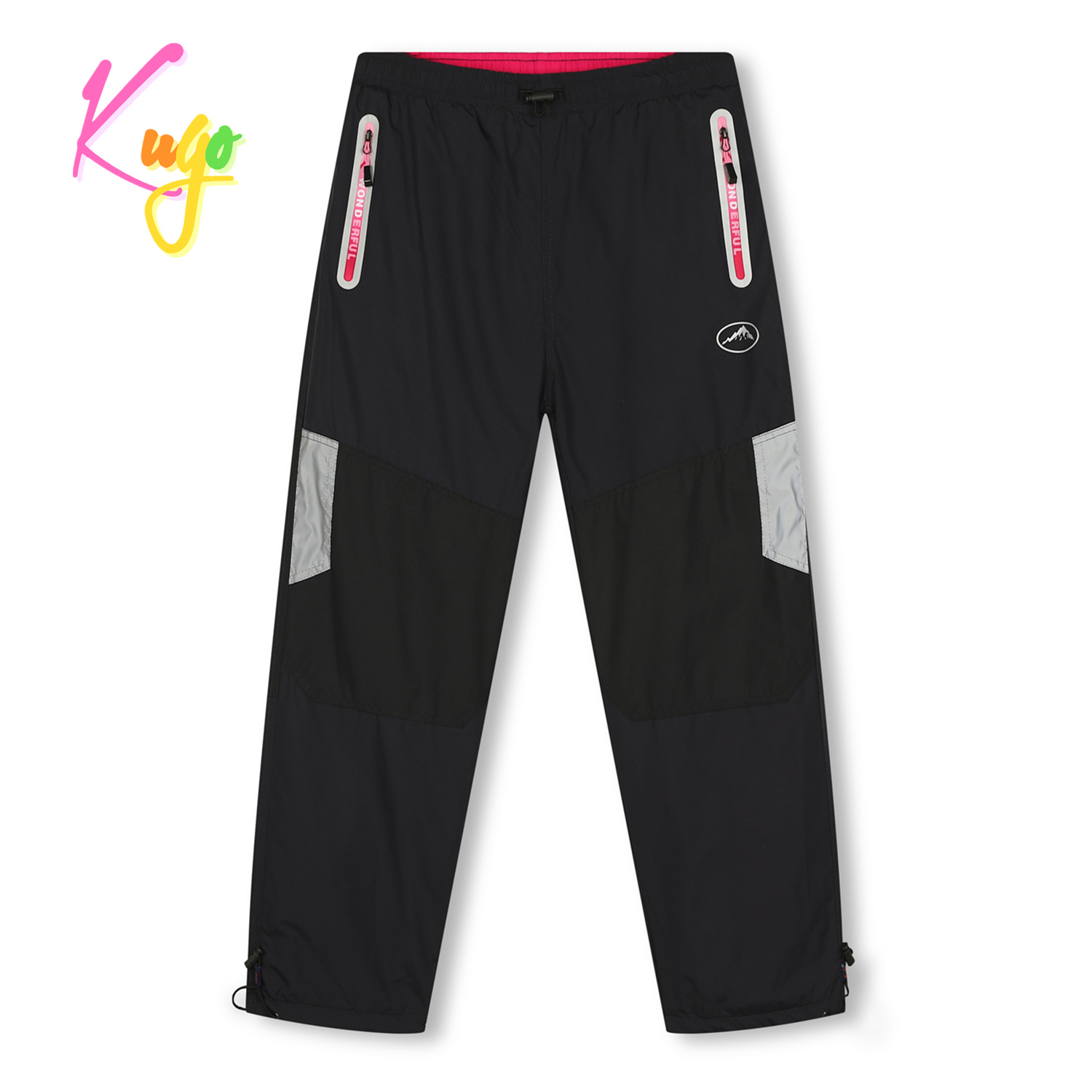 Dívčí zateplené šusťáky Kugo: Složení 100% polyester, vrchní materiál nepromokavý kvalitní šusťák, uvnitř jsou kalhoty zateplené hřejivým flísem. V pase pružná guma + olivka na stažení, na bocích dvě kapsy na zip, na konci nohavic stahování, kalhoty mají reflexní prvky.