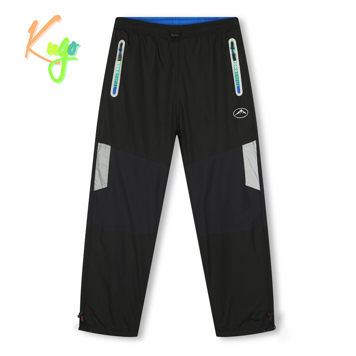 Chlapecké zateplené šusťáky Kugo: Složení 100% polyester, vrchní materiál nepromokavý kvalitní šusťák, uvnitř jsou kalhoty zateplené hřejivým flísem. V pase pružná guma + olivka na stažení, na bocích dvě kapsy na zip, na konci nohavic stahování, kalhoty mají reflexní prvky.