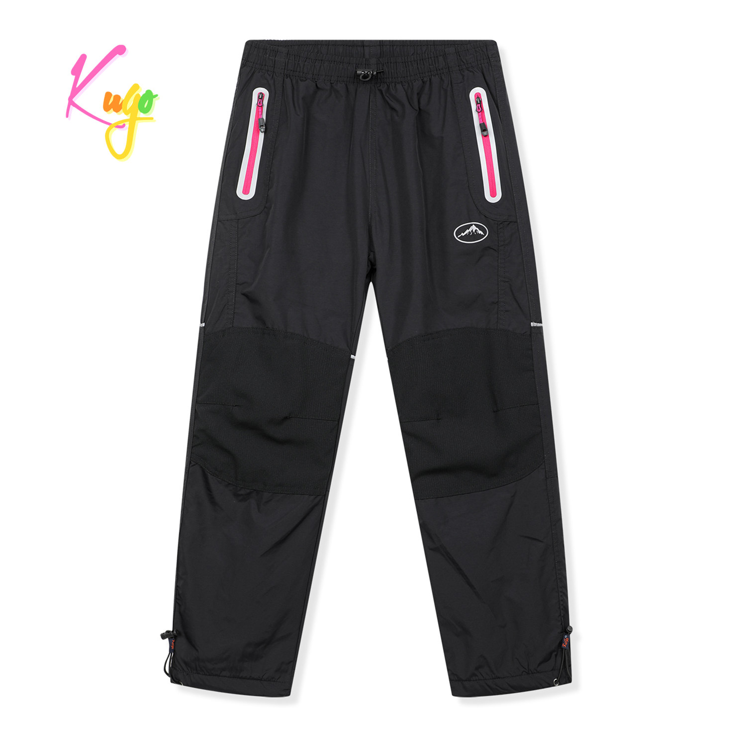 Dívčí zateplené šusťáky Kugo: Složení 100% polyester, vrchní materiál nepromokavý kvalitní šusťák, uvnitř jsou kalhoty zateplené hřejivým flísem. V pase pružná guma + olivka na stažení, na bocích dvě kapsy na zip, na konci nohavic stahování, kalhoty mají reflexní prvky.