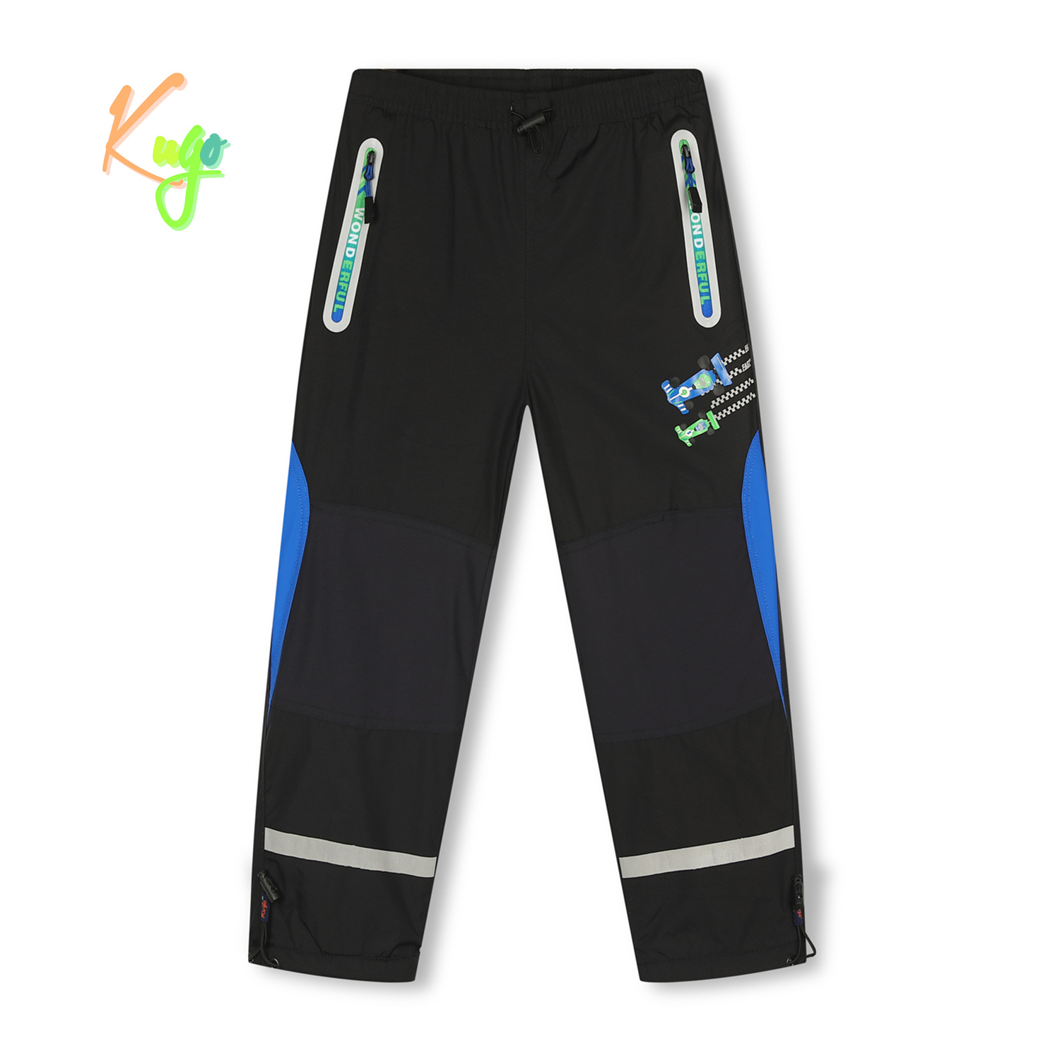 Chlapecké zateplené šusťáky Kugo: Složení 100% polyester, vrchní materiál nepromokavý kvalitní šusťák, uvnitř jsou kalhoty zateplené hřejivým flísem. V pase pružná guma + olivka na stažení, na bocích dvě kapsy na zip, na konci nohavic stahování, kalhoty mají reflexní prvky.
