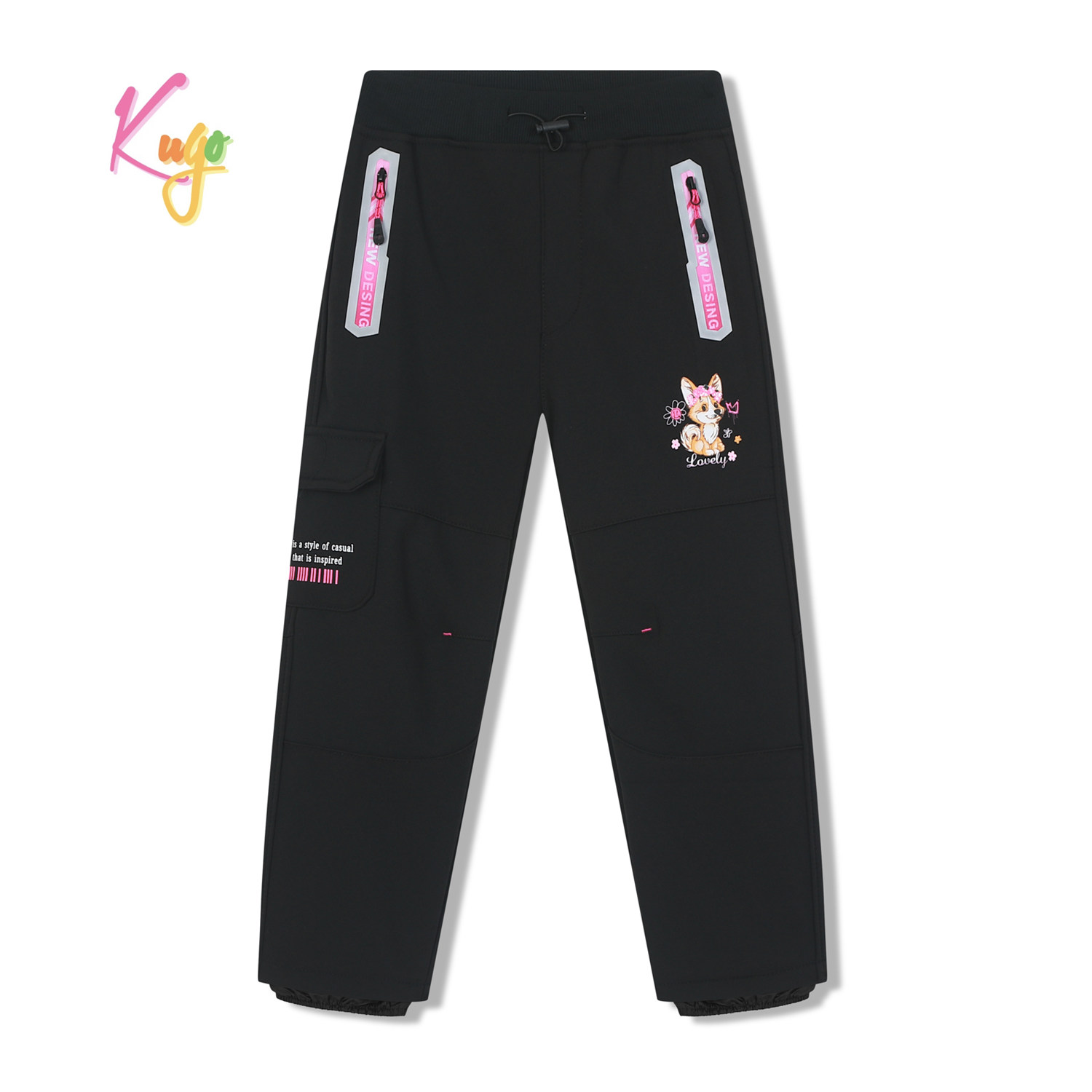Dívčí zateplené softshellové kalhoty Kugo: Složení 100% polyester, nepromokavý povrch, uvnitř jemný flís, v pase pružná guma + stahování, na bocích kapsy na zip, na nohavici kapsa, reglexní prvky, pohodlný a prodyšný materiál. Vhodné na podzim a zimu do deště i sněhu. Na konci nohavic membrány proti vniknutí vody.