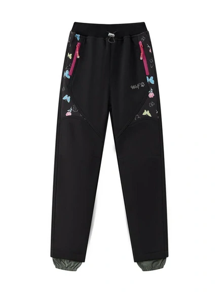 Dívčí softshellové kalhoty WOLF zateplené jemným flísem: Složení 100% polyester, voděodolné, nepromokavé, neprofouknou, v pase do širšího nápletu s gumičkou a olivkou na stažení, dole v nohavici šusťáková vsadka, reflexní prvky, na přední straně dvě zapínací kapsy.