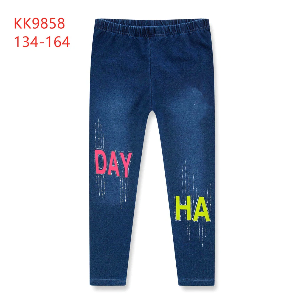 Dívčí pružné legíny/džegíny KUGO: Složení 95% bavlna, 5% elastan, riflový design, v pase pružná guma, s potiskem a kamínky.