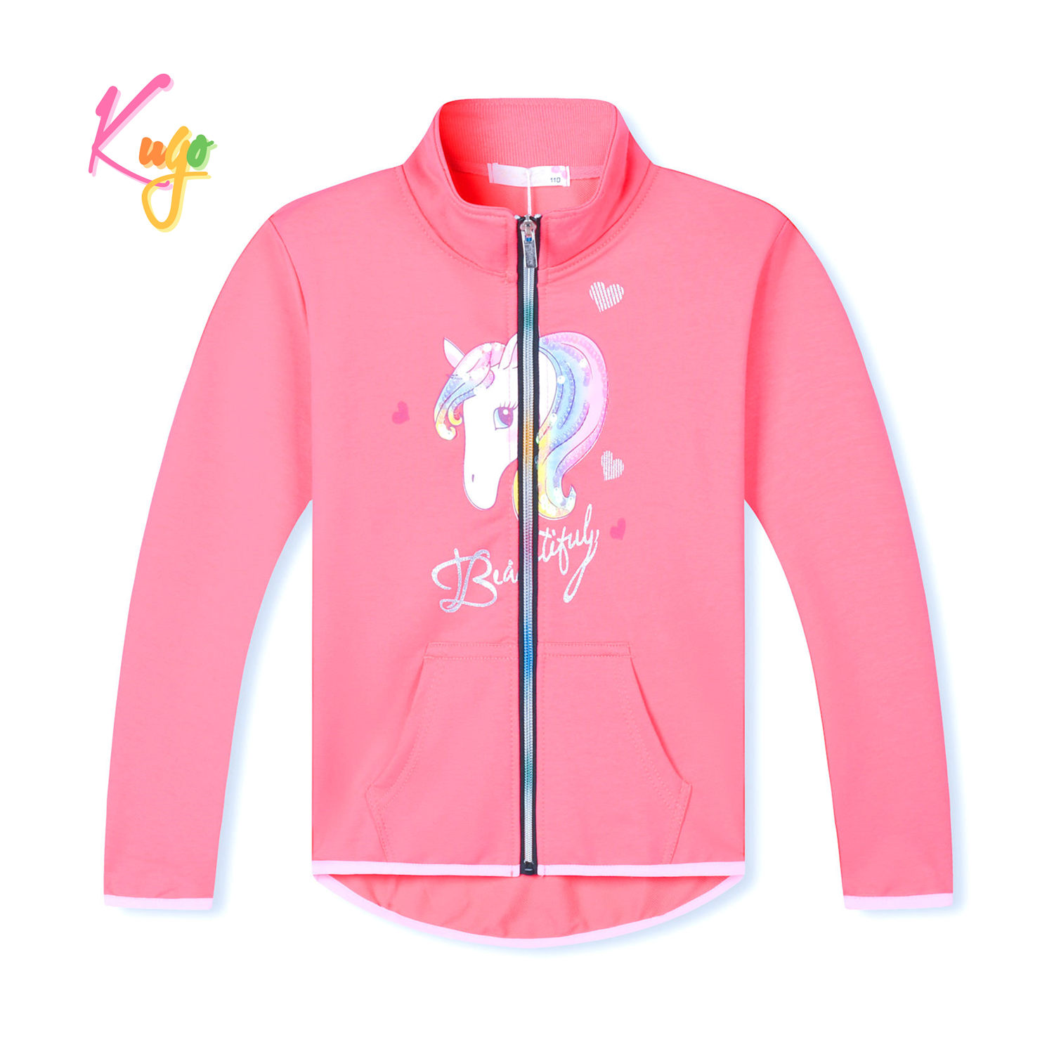 Dívčí mikina na zip: Složení 95% bavlna, 5% elastan, zapínání po celé délce na zip, na bocích dvě kapsy, rukávy a dolní okraj mikiny zakončený pružnou gumičkou.